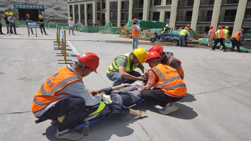 本次演練模擬橫店受臺風影響持續暴雨,項目三期1#地庫施工區域涌進大量雨水,積水深度達到40CM,施工人員被困地下室施工現場。在發現“險情”后,演練啟動二級應急響應機制,圍繞集結待命、巡查預警、疏散搶險、人員轉移等科目開展實戰演練。演練分工明確,各環節協調有序。面對“險情”,物資組將防汛物資快速運至現場,搶險組進入現場后檢查電源、照明線路架空,搶險、救援組進行了沙袋封堵、應急抽水、人員疏散等科目演練,參演人員快速反應、迅速處置,受傷人員按照應急預案及時轉移并臨時救護,整個過程表現出良好的團隊合作精神。